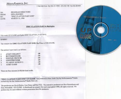 Summary Details: Eric clapton up close original 1998 mediaamerica us promotional only 3 cd radio show. Including 30 tracks this show as first aired in april 1998 and rarely has a set of full cue sheets 98 15 16 17 part i1. Fathers eyes2. Sick and tired3. One chance4. For y...